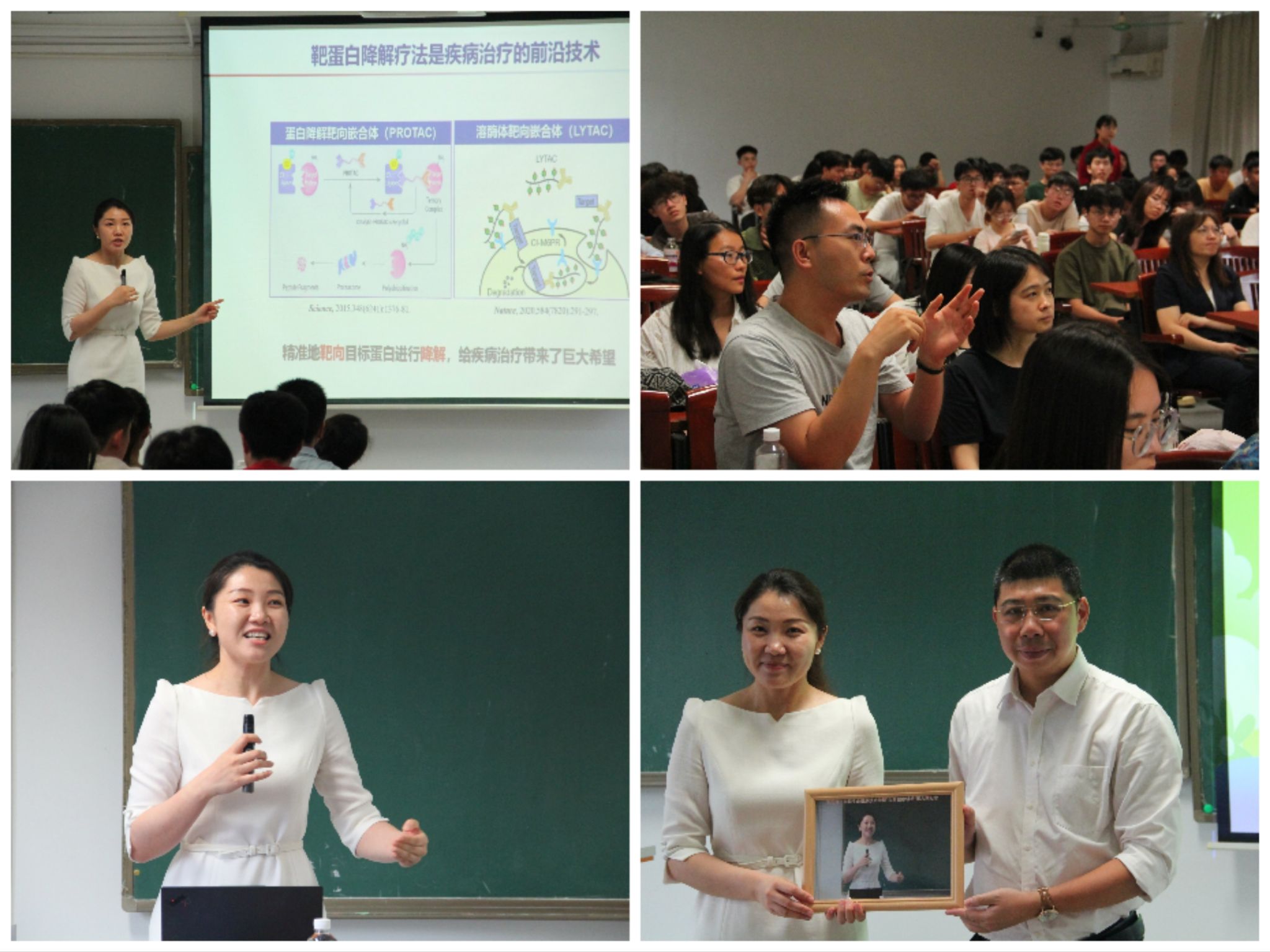在学术报告环节,张云娇教授以《NanoTAC--蛋白质稳态调控的纳米策略》为题,介绍了基于多功能仿生纳米受体的NanoTAC技术以及在基于该技术靶向降解突变p53的癌症精准治疗方面取得的重要进展。整场讲座生动形象、内容丰富有趣,使老师和同学们受益匪浅。互动交流环节,师生们与张教授展开热烈讨论交流。讲座结束后,谢炯标为张云娇教授赠送了纪念品,感谢其精彩讲授。