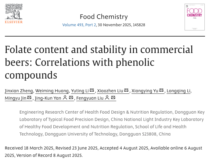 2025年8月,公司硕士研究生郑锦贤以第一作者身份于国际食品顶级期刊《Food Chemistry》(IF = 9.8)在线发表题为“Folate content and stability in commercial beers: Correlations with phenolic compounds”的研究性文章。公司刘丰源助理研究员和闫景坤教授为该论文共同通讯作者。