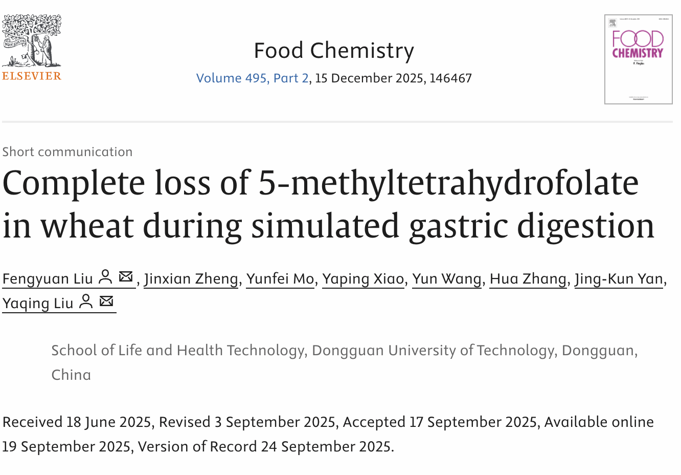 2025年9月,公司刘亚青教授团队于国际食品顶级期刊《Food Chemistry》(IF = 9.8)在线发表题为“Complete loss of 5-methyltetrahydrofolate in wheat during simulated gastric digestion”的快报研究性文章。公司刘丰源助理研究员为第一作者和通讯作者,刘亚青教授为该论文共同通讯作者。