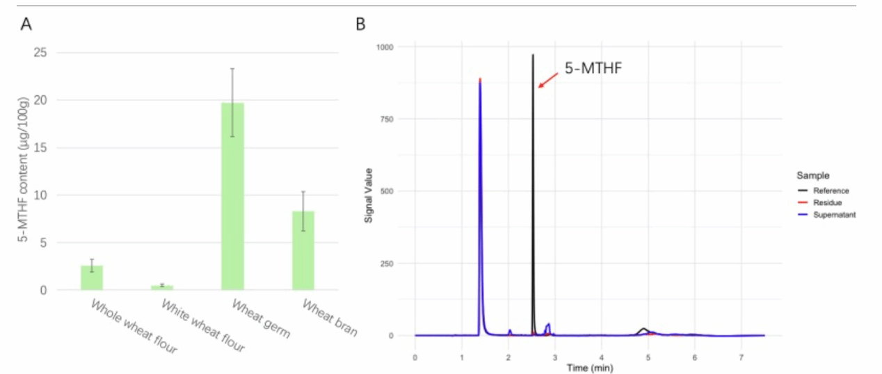 5-甲基四氢叶酸(5-MTHF)作为天然叶酸的主要形态,正日益被视为较传统叶酸更安全的强化替代物。然而,关于其消化稳定性的研究结论并不一致。本文表明,在模拟胃消化条件下,5-MTHF在小麦基质中会发生显著且近乎完全的损失。该损失在所有受测的小麦组分中均可观察到,并呈现浓度依赖的动力学特征:当小麦粉浓度降低50倍时,叶酸保留率由“不可检测”提升至约80%。在抗氧化方面,抗坏血酸可显著提高其稳定性,而没食子酸几乎无作用。以氮气置换并不能阻止5-MTHF 的损失,且对消化残渣的酶促分析进一步证实,这并非由简单的物理吸附造成。综合来看,小麦内源性成分可促进5-MTHF的快速损失,且该过程在很大程度上对氧不敏感。此发现对现有的叶酸强化实践提出挑战,并强调了开发适用于谷物体系的叶酸保护策略的必要性。