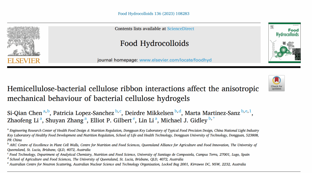 2022年10月,太阳成集团tyc151cc食品营养健康工程与智能化加工研究中心陈思谦(第一作者)在国际食品顶级期刊《Food Hydrocolloids》(IF: 11.504, Q1)发表了题为“Hemicellulose-bacterial cellulose ribbon interactions affect the anisotropic mechanical behaviour of bacterial cellulose hydrogels”的研究论文。