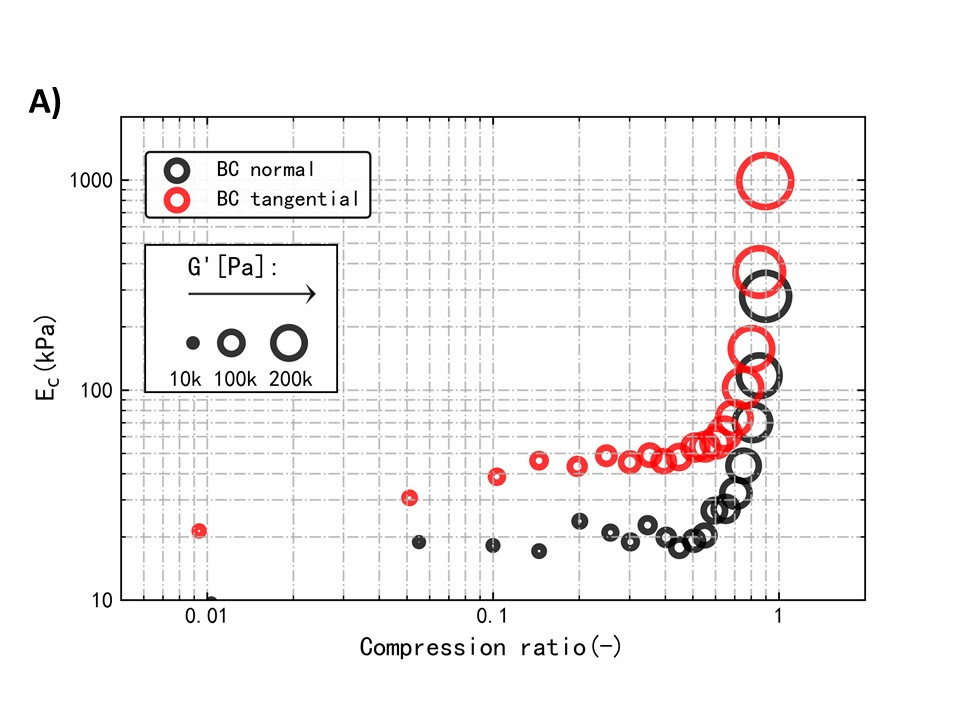 研究发现,AX和MLG虽无法对细菌纤维素的结晶结构有显著影响,但可以球状团聚物的形式吸附在纤维表层。而通过两个方向上的力学及流变学测试发现,两种半纤维素在小应变(线性黏弹区,小振幅振荡剪切实验)对细菌纤维素水凝胶的各向异性力学性能影响较小,而在大应变(非线性黏弹区,压缩-应力松弛实验)条件下能减少细菌纤维素水凝胶力学性能的各向异性程度。本研究介绍了一种简单、绿色的方法调控细菌纤维素凝胶的各向异性力学性能,为进一步开发细菌纤维素的利用价值提供了经验。